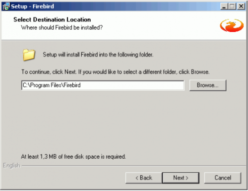 We recommend abbreviating the directory path proposed by the install wizard and using the directory: C:\Program Files\Firebird: