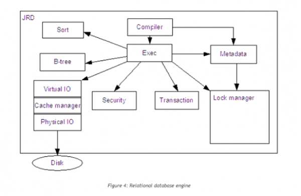 - relational database engine (JRD): This subsystem performs the actual queries.
