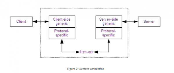 It can be viewed as a layered system: conceptually, the client sends requests to the server, through a generic communication layer. The generic layers communicate through a protocol-specific layer, and the protocol-specific layers communicate through the operating system's network stack. This is much like to a two-layered version of the OSI reference network model.
