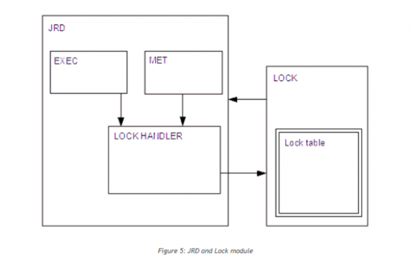 Lock handling is separated into two major parts: the lock handler sub-module inside the JRD and the Lock module that handles concurrent access to the lock table. Figure 5 illustrates relationship between these parts.