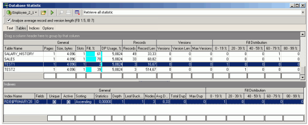 takes a while, as there is no descending index for the Optimizer to use so it has to perform a temporary sort. So depending upon how much cache you have specified in the firebird.conf (TempBlockSize (in earlier Firebird versions, SortMem) and TempCacheLimit), the Optimizer will probably not only have to load all 1,429 pages into the cache, but probably use the hard drive as well. The sort file reaches over 100 MB, as the Optimizer has created a file which includes all the data from test2, including all the empty spaces in the txt field, as it cannot know whether the empty spaces are required or not. The internal ordering is performed on the complete column width for all records.
