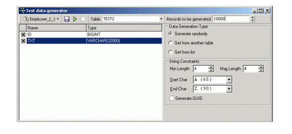 Here you can directly see for example, when we look at the test tables, and generate some test data for test2 (refer to Test Data Generator), for example 10,000 further records, all 4 letters (A-Z) long: